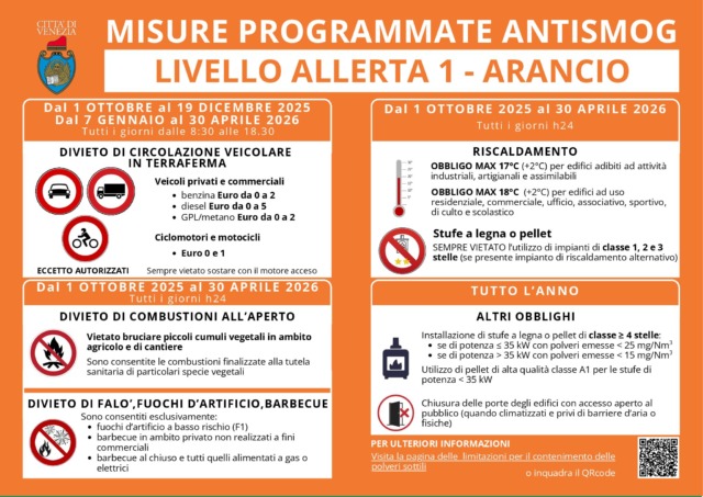 Il Comune di Venezia ha fatto sapere che da sabato 15 novembre 2025, entreranno in vigore le limitazioni del traffico, valide solo per la Terraferma, previste dall’allerta arancione.