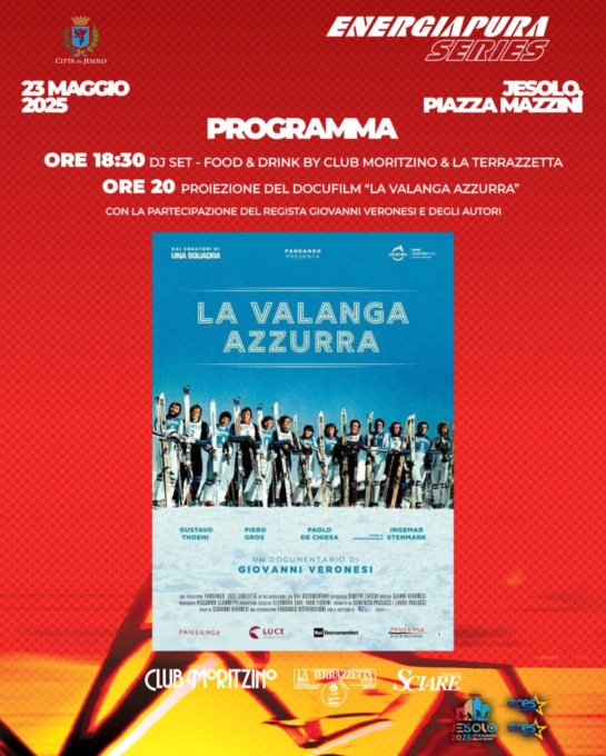 Il via ufficiale è fissato per la serata di venerdì 23 maggio, con un omaggio alla storia dello sci italiano. In Piazza Mazzini, sul maxischermo del Villaggio Energiapura, verrà proiettato il docufilm “La Valanga Azzurra”, alla presenza del regista Giovanni Veronesi e degli autori. La serata sarà condotta da Marco Di Marco, direttore di Sciare Magazine, media partner dell’evento, che guiderà un salotto di riflessioni e testimonianze sull’epoca irripetibile degli anni ‘70, quando lo sci italiano diventava leggenda.