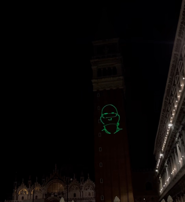 Con l’arrivo dell’oscurità della notte, gli attivisti ne hanno approfittato per illuminare il campanile di San Marco. Infatti, con un proiettore laser hanno scritto sulla facciata “No space 4 Bezos” e hanno proiettato anche la sigla “FCK BZS”. Inoltre, sono riusciti a “disegnare” la faccia stilizzata del miliardario: prima sorridente, con la classica freccia del logo Amazon; poi triste o imbronciato, capovolgendola.