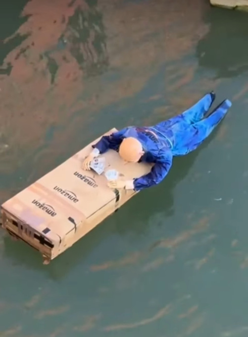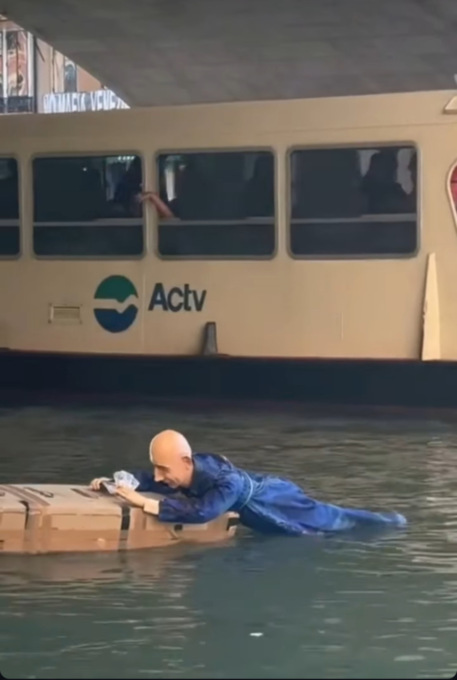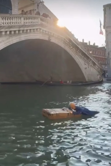 Infatti, mentre i 43 militanti del finto matrimonio venivano trattenuti in questura, altri hanno mandato alla deriva tra i canali un manichino, con le fattezze di Jeff Bezos, che usava come zattera degli scatoloni di Amazon. Il “naufrago” è riuscito a raggiungere il Ponte di Rialto, attirando l’attenzione dei turisti e dei battelli.