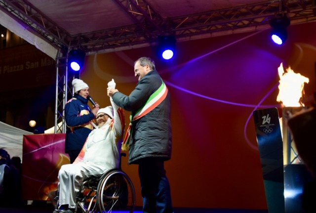 A concludere la staffetta del fuoco olimpico è stata Sandra Tuccolo, atleta paralitica di tiro con l’arco che, una volta giunti a San Marco, ha acceso il braciere con al suo fianco il Sindaco.