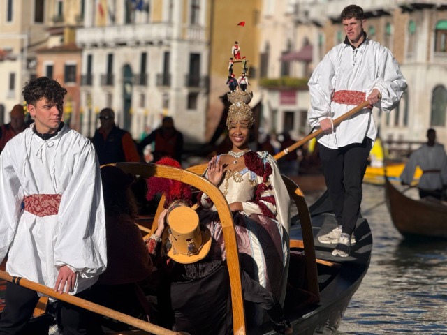 Ecco il costume realizzato da Francesco Briggi, dell’Atelier Pietro Longhi, che ha indossato la diciottenne Maria dell’Anno 2026, sfoggiandolo per la sua passerella d’onore prima in gondola lungo il Canal Grande e poi in Piazza San Marco.