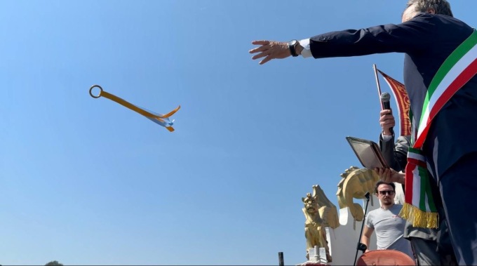 “Noi ti sposiamo, o mare, in segno di vero e perpetuo dominio”. Con questa formula di rito pronunciata dal sindaco di Venezia Luigi Brugnaro e con il lancio dell’anello dogale nelle acque davanti la chiesa di San Nicolò del Lido è stato rinnovato questa mattina lo Sposalizio del mare. Alla cerimonia hanno partecipato il patriarca Francesco Moraglia e l’ammiraglio della Marina Militare Andrea Petroni.