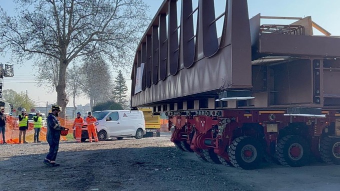Per posizionare il nuovo manufatto sono state utilizzate tre autogru, una da 500 e due da 100 tonnellate oltre a due SMFP (Self-propelled modular transporter) veicoli piattaforma con un’ampia serie di ruote utilizzati per il trasporto di oggetti voluminosi come grandi elementi di ponti, impianti di raffinazione del petrolio, motori e altri oggetti che sono troppo grandi o pesanti per i camion.