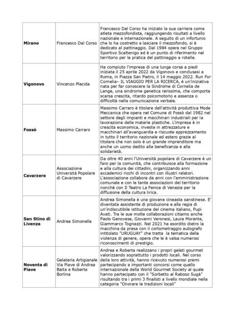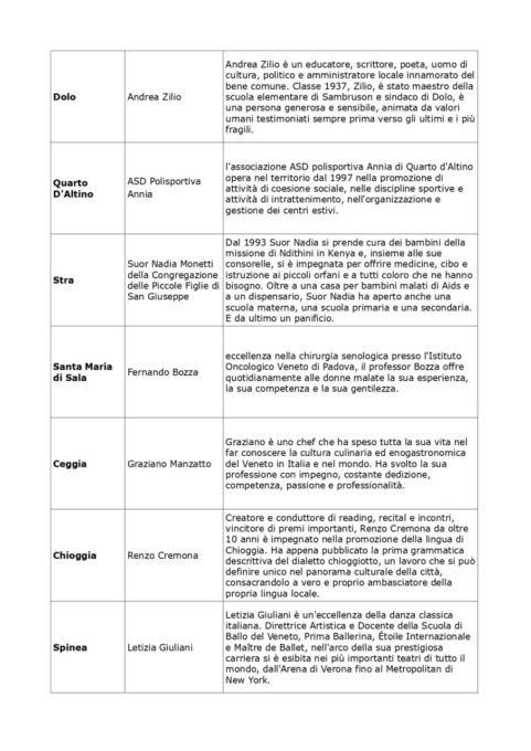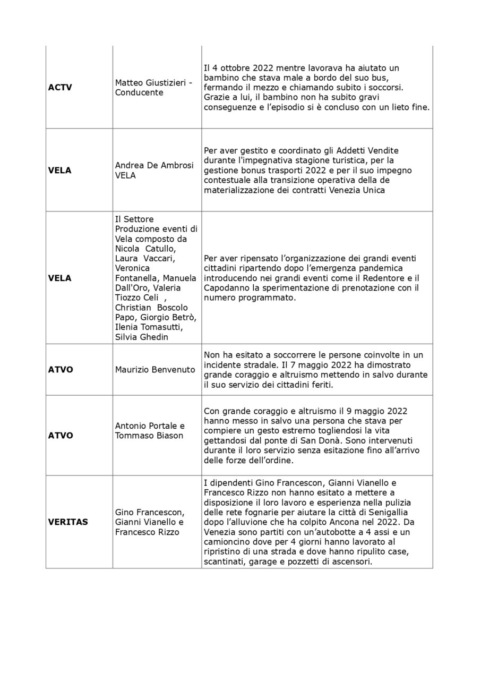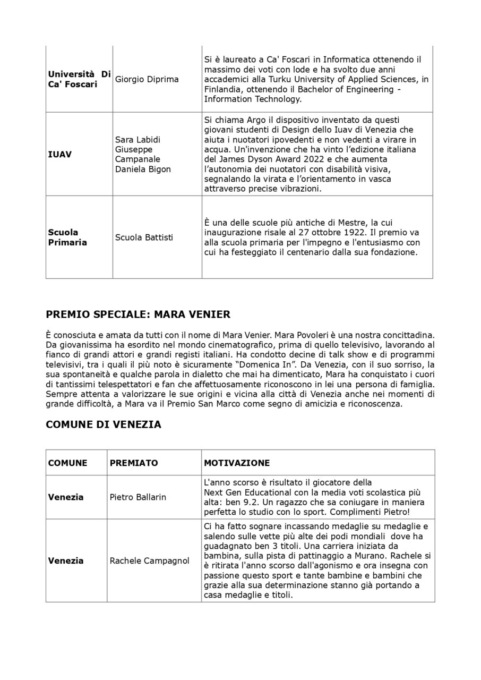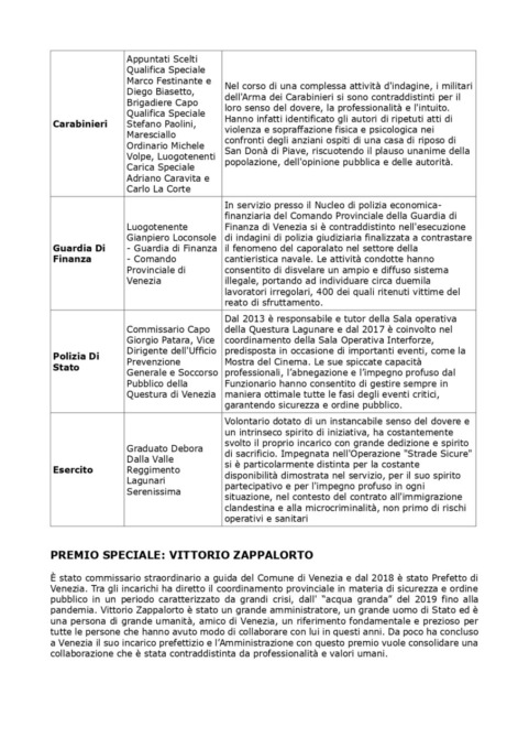 Sono quindi iniziate le premiazioni ufficiali con i sindaci dei Comuni della Città metropolitana che hanno consegnato un riconoscimento a singoli, enti o associazioni meritevoli di aver dato lustro alla città con impegno quotidiano, valorizzando il territorio metropolitano e costituendo un esempio di tenacia, determinazione, generosità e preparazione. Spazio, poi, anche alle categorie economiche, rappresentate da Cna, Confesercenti, Confartigianato, Confcommercio, Confindustria, alle aziende ospedaliere Ulss 4 e Ulss 3, il cui personale opera nei vari settori con spirito di sacrificio, oltre alla Federazione Italiana Medici di Famiglia. Un riconoscimento è stato consegnato anche alle società partecipate del Comune di Venezia (Actv, Vela, Veritas) e ad Atvo; sono seguite poi le premiazioni del mondo culturale e delle università, individuate nella Biennale di Venezia, Ca’ Foscari, Iuav e la scuola Cesare Battisti.