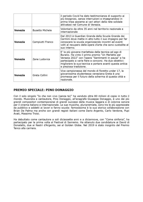 Il sindaco ha infine voluto consegnare quattro premi alla carriera a personalità che hanno portato il nome di Venezia nel mondo o che hanno lavorato con grande professionalità in città: alla campionessa mondiale di nuoto Federica Pellegrini, all’attrice e presentatrice Mara Venier, all’ex prefetto Vittorio Zappalorto e al musicista e cantautore Pino Donaggio. Al termine della cerimonia, che si è conclusa con l’Inno di San Marco, a tutte le donne è stato consegnato il tradizionale bòcolo.