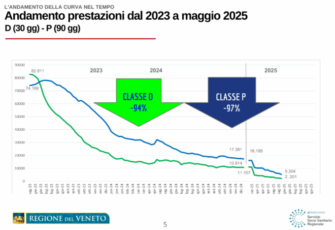 Lo stesso andamento riguarda anche le classi di priorità: la classe D (differibile) è passata da oltre 82mila prestazioni in attesa a poco più di duemila, mentre la classe P (programmabile) è scesa da circa 74mila a cinquemila. Un risultato che rappresenta una delle più forti riduzioni mai registrate nel sistema sanitario regionale.