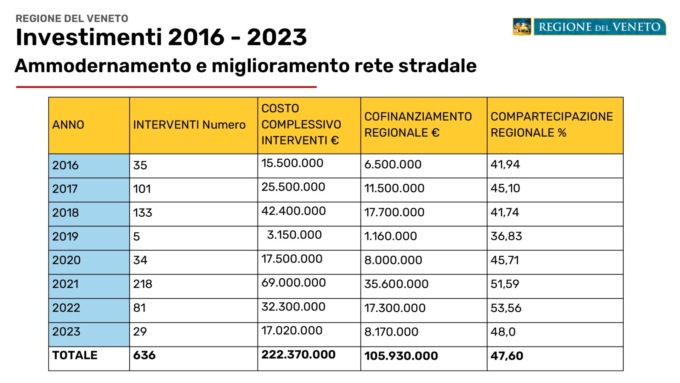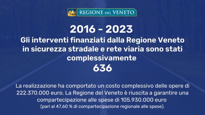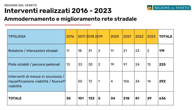 Tra il 2016 e il 2022, gli interventi finanziati dalla Regione nel campo della sicurezza stradale e dell’ammodernamento della rete viaria sono stati 607, con un costo complessivo di 205 milioni 350 mila euro, con una compartecipazione regionale alle spese pari a 97 milioni 760 mila euro (il 47,60% del totale).