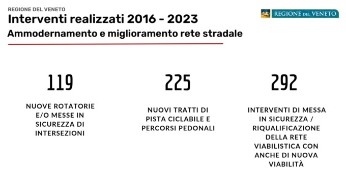 Sono state realizzate 117 nuove rotatorie e/o messe in sicurezza di intersezioni stradali; 212 nuovi tratti di piste ciclabili e percorsi pedonali; 278 interventi di messa in sicurezza e/o riqualificazione della rete viabilistica con realizzazione anche di nuova viabilità.