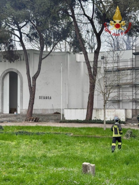 “Sotto controllo il principio d’incendio al padiglione serbo. I vigili del fuoco hanno prontamente arginato il rogo che si è originato dal tetto della struttura. Non si sono registrati feriti”