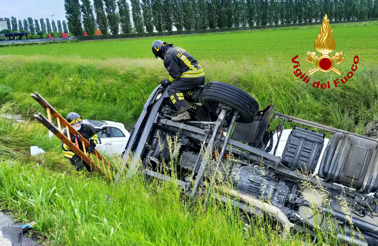 Incidente tra autocisterna e utilitaria, i mezzi finiscono nel canale di scolo