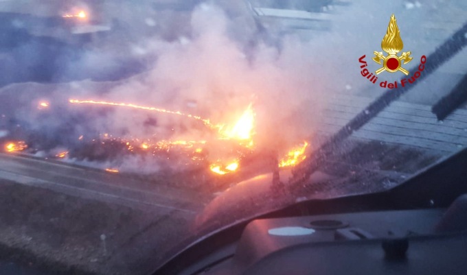 Oltre 15 i lanci effettuati sulle fiamme dall’elicottero prima del rientro per le effemeridi. L’incendio è stato circoscritto dopo circa due ore e sono poi partite le operazioni di spegnimento degli ultimi focolai.