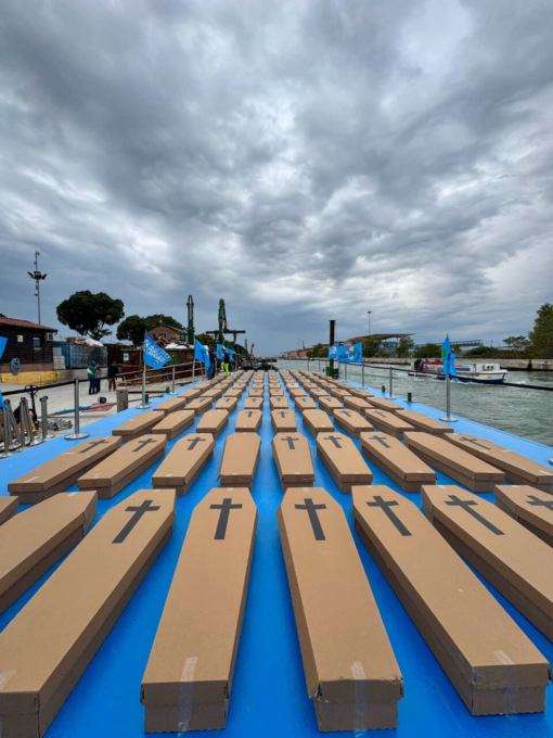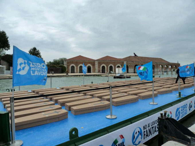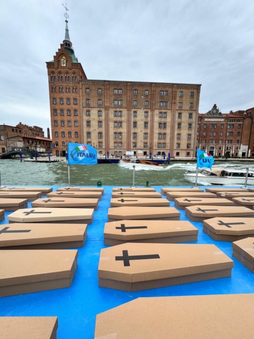 Nel 2024 essa si è ulteriormente sviluppata con una serie di flash-mob silenziosi nelle piazze delle principali città italiane. Prima tappa a Roma, con 1041 bare in Piazza del Popolo, tante quante i morti sul lavoro in Italia nel 2023. Poi Napoli, Firenze, Milano, Bologna, Perugia, Bari e Genova, dove sono state posate tante bare quanti i morti sul lavoro che si sono contati, regione per regione. A Venezia abbiamo scelto l’elemento che caratterizza questa città, l’acqua.