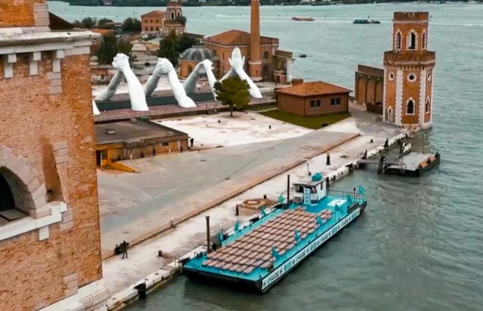 Il pontone che è ormeggiato qui fuori ha trasportato le 101 bare relative ai morti sul lavoro in Veneto nel 2023. Esso ha attraversato il canale della Giudecca, lambendo la Basilica della Salute e passando davanti a Piazza San Marco e Palazzo Ducale. Si è fermato qui, in quello che storicamente è “la fabbrica di Venezia”, il luogo più vocato al lavoro.
