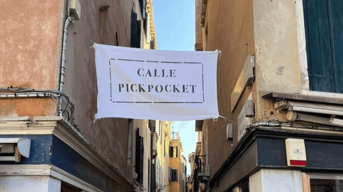 Ma proprio per protestare contro il fenomeno del “pickpocketing” (termine inglese che indica proprio i borseggi), nelle scorse ore a Venezia è andata in scena una protesta silenziosa. Uno striscione con la scritta “Calle Pickpocket” (in copertina) è stato affisso all’ingresso della Calle della Mandola, stretta via che collega Campo Sant’Angelo a Campo Manin, a pochi passi da Rialto.