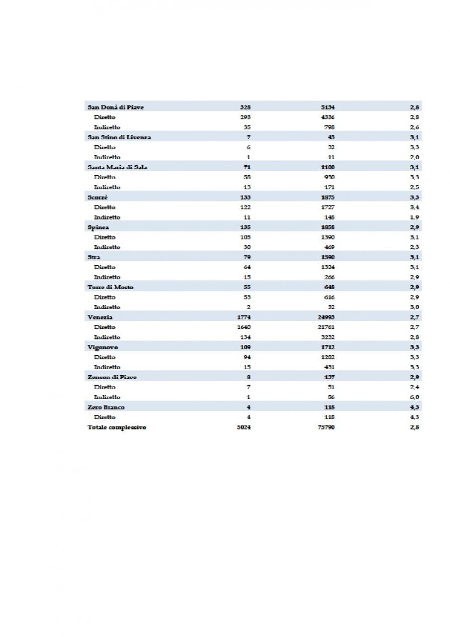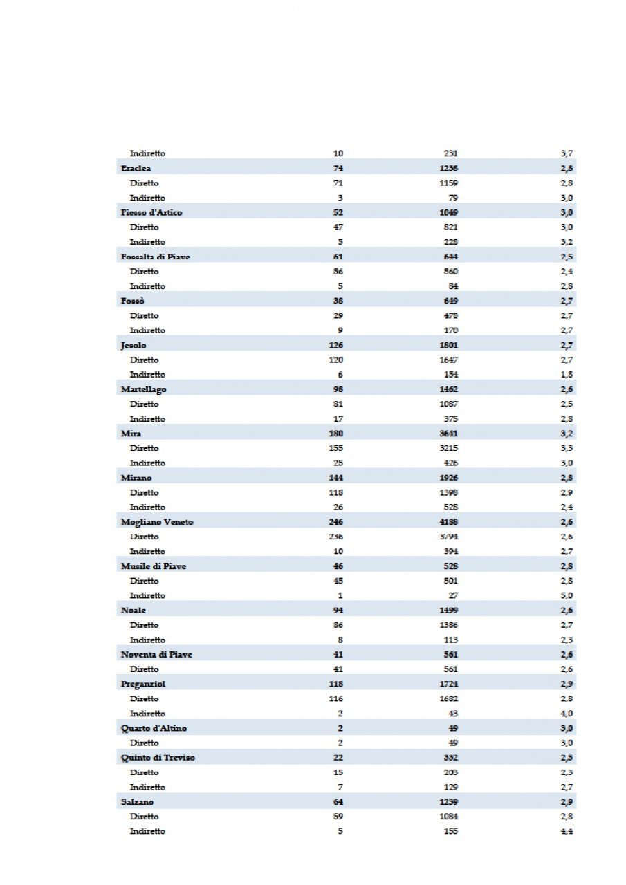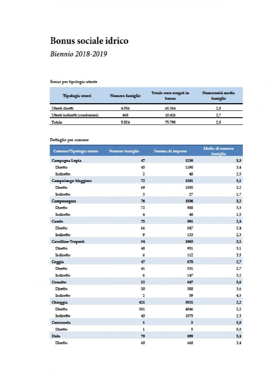 La Veritas, società per azioni, ha erogato un totale di 75.790 euro di bonus idrici a 5.024 famiglie del territorio, nel biennio 2018 e 2019 con una media di 15,10 euro a utenza, c0me è dimostrabile nella tabella che riporta la divisione territoriale.