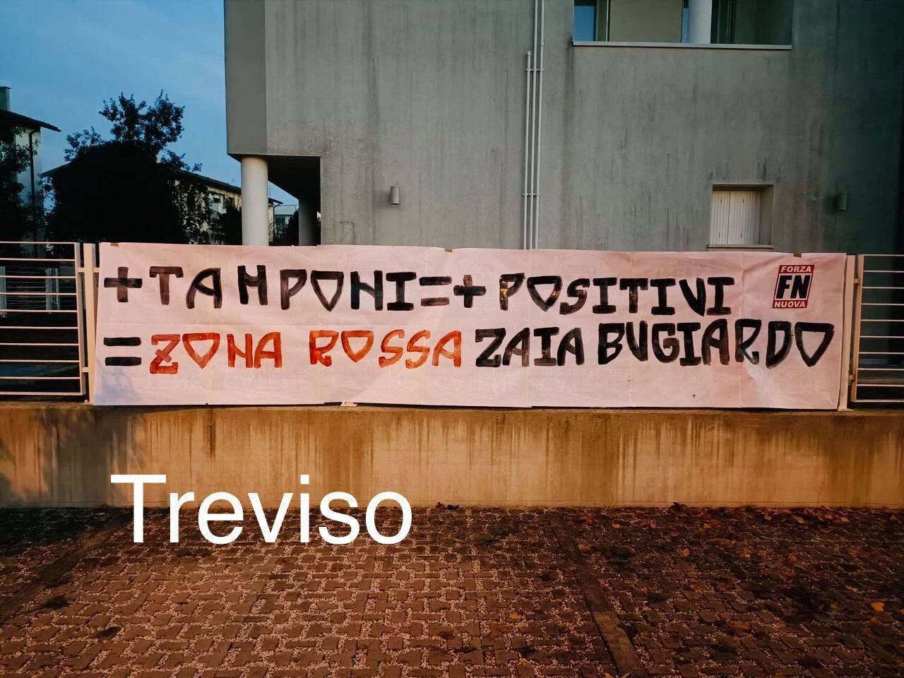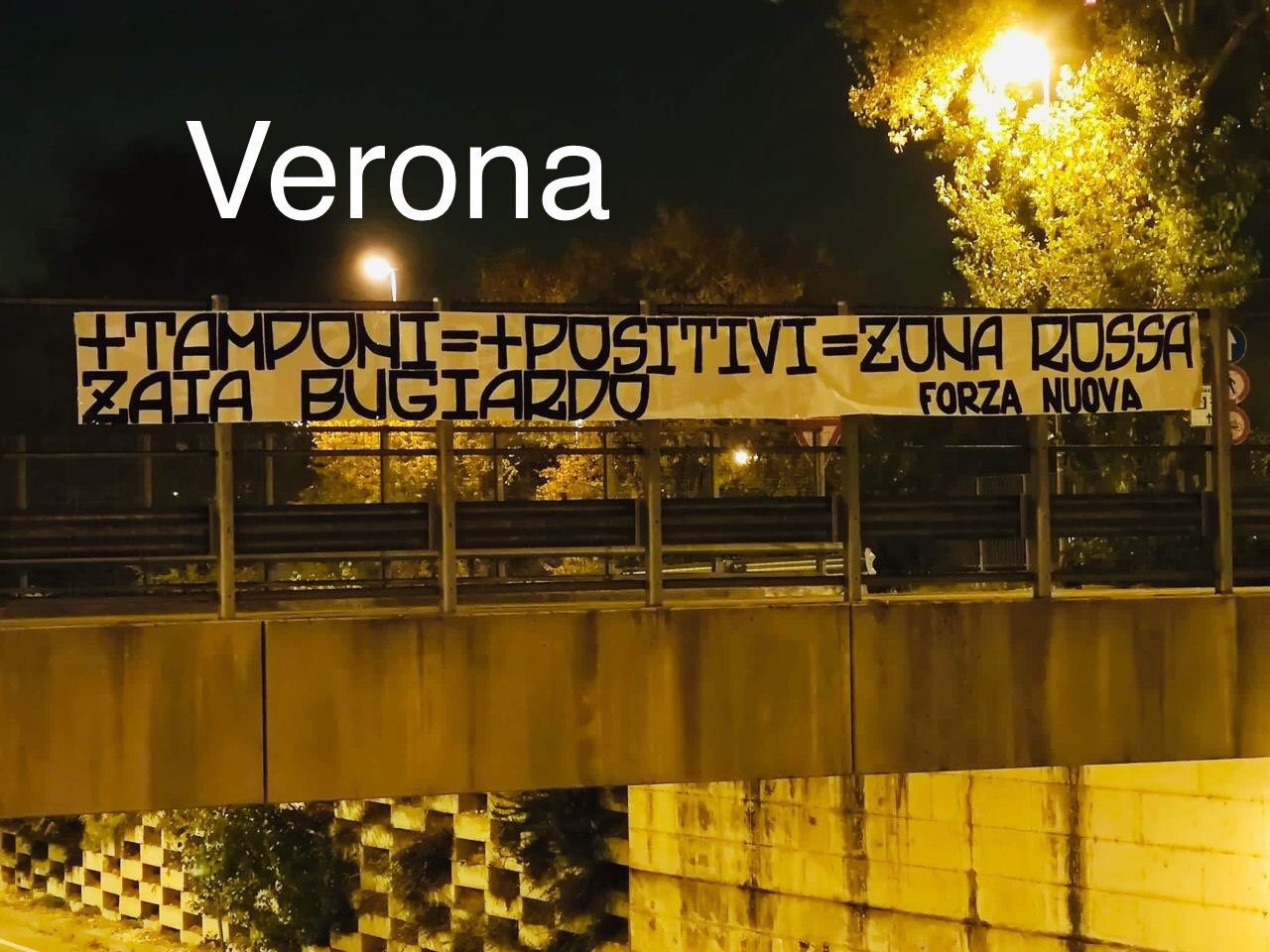 Sullo striscione si capisce forte e chiaro il messaggio di Forza Nuova dove gli esponenti asseriscono che se si fanno più tamponi si troveranno più positivi e questo porterà immancabilmente il Veneto ad entrare nella zona rossa. Leardini e Castellini affermano:
