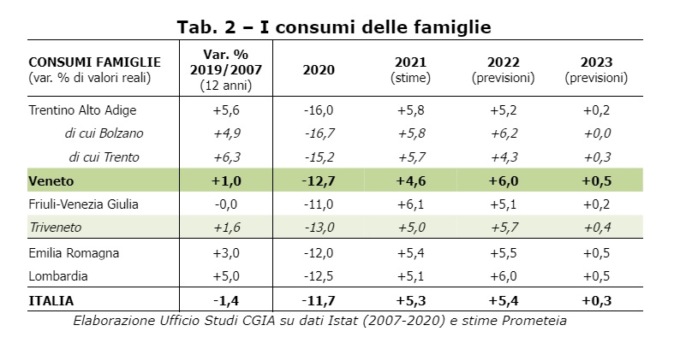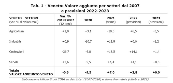 Sempre quest’anno, a livello settoriale saranno le costruzioni a dare il maggiore impulso alla ripresa economica (+14,1 per cento), seguono l’agricoltura (+6,5 per cento), i servizi (+4,1 per cento) e, infine, l’industria (+0,6 per cento). Sebbene nel biennio 2021-2022 l’edilizia abbia registrato in Veneto saggi di crescita da record, va comunque sottolineato che rispetto al 2007, anno che precede la crisi dei subprime, questo comparto deve ancora recuperare quasi 11 punti percentuali.