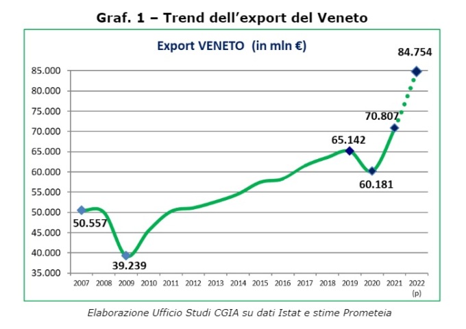 L’export veneto, invece, è destinato a subire una frenata: rispetto al +11,2 per cento registrato nel 2021, quest’anno la crescita sarà del +6,2 per cento; in termini reali, entro il prossimo 31 dicembre le nostre vendite all’estero dovrebbero toccare gli 84,7 miliardi di euro.