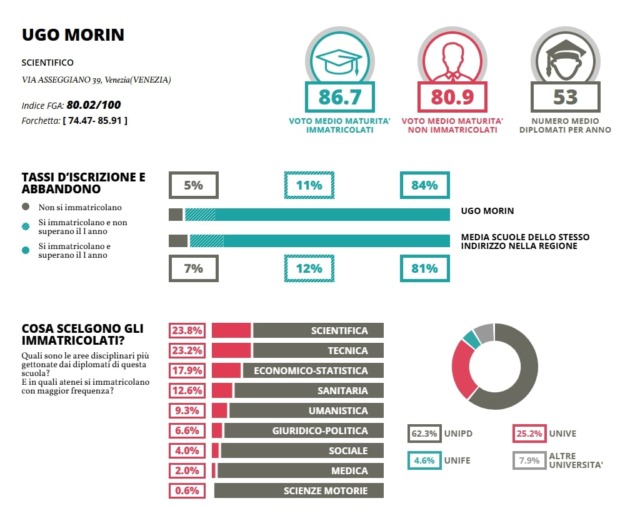 Per quanto riguarda il territorio della provincia di Venezia, la migliore scuola in assoluto, ovvero quella con l’indice FGA più alto (80,02/100), il liceo Scientifico Ugo Morin situato in via Asseggiano a Mirano.