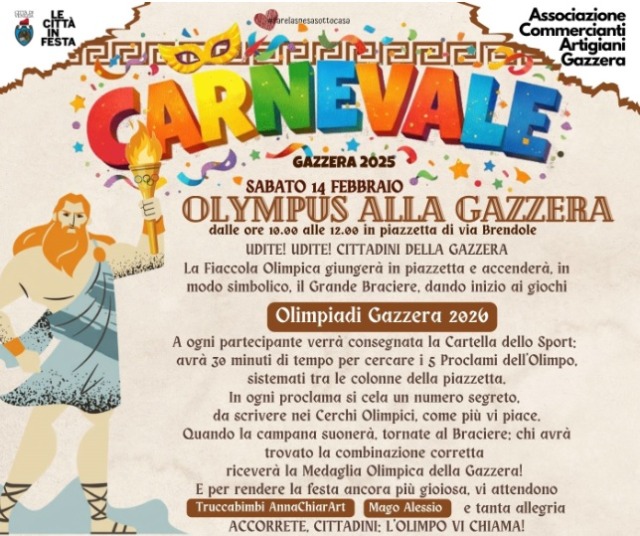 Una festa di Carnevale che celebra il territorio e la socialità con un omaggio ai Giochi Olimpici: “Carnevale Olympus alla Gazzera” è questo. L’evento, organizzato dall’Associazione Commercianti Artigiani Gazzera e inserito nel palinsesto de “Le Città in Festa”, si terrà sabato 14 febbraio in piazzetta Brendole dalle 10 alle 12.