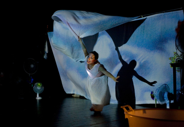 Con l’aiuto dei tre attori in scena, Piccolo Vento parla al pubblico, attirando l’attenzione dei bambini sull’osservazione delle piccole cose della natura e sull’ascolto del racconto musicale.
