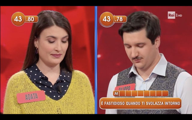 La competizione con l’altra concorrente è stata serrata, arrivando a un testa a testa finale, ma ha avuto la meglio Filippo con meno di 4 secondi rimanenti. Dopo aver salutato la sfidante perdente e sua mamma, Marco Liorni ha chiesto ai partecipanti di raccontare la propria vita in 20 secondi. Il veneziano ha voluto raccontare che ama i giochi da tavolo e passare il tempo con la sua famiglia e suoi amici, oltre che con la sua fidanzata. Inoltre, ha condiviso che è un grande appassionato di poesie e di storia.