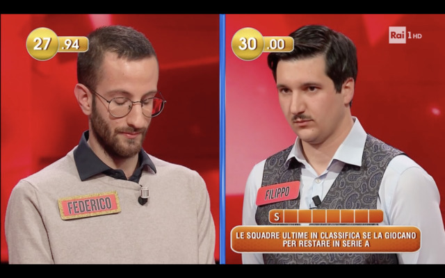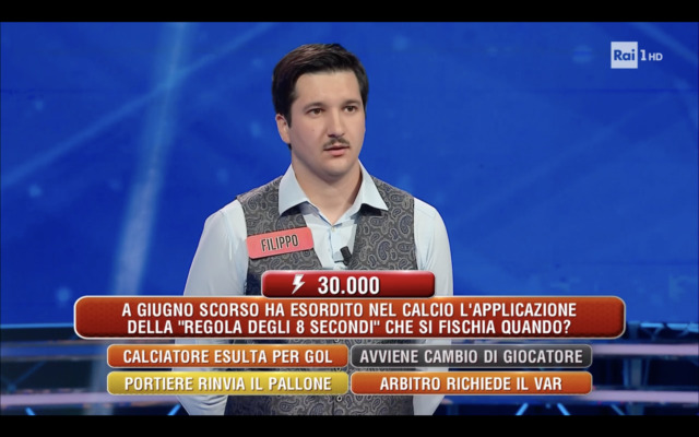 Dopo le risposte sbagliate degli altri due partecipanti, Filippo è riuscito a indovinare che il “Lixa” nell’antica Roma era un venditore ambulante di cibo, andando così in vantaggio. Tuttavia, la domanda che ha scelto dopo era quella pigliatutto, decidendo di sfidare così il campione in carica, sbagliando però, lasciando così all’altro sfidante la risposta corretta.