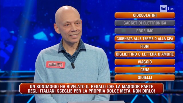 Gianluca è andato convinto sul fatto che i profumi non siano il regalo più popolare della festa degli innamorati, rispondendo correttamente, ma rischiando visto che, come ha spiegato Greta, è al secondo posto con altri regali presenti in lista.